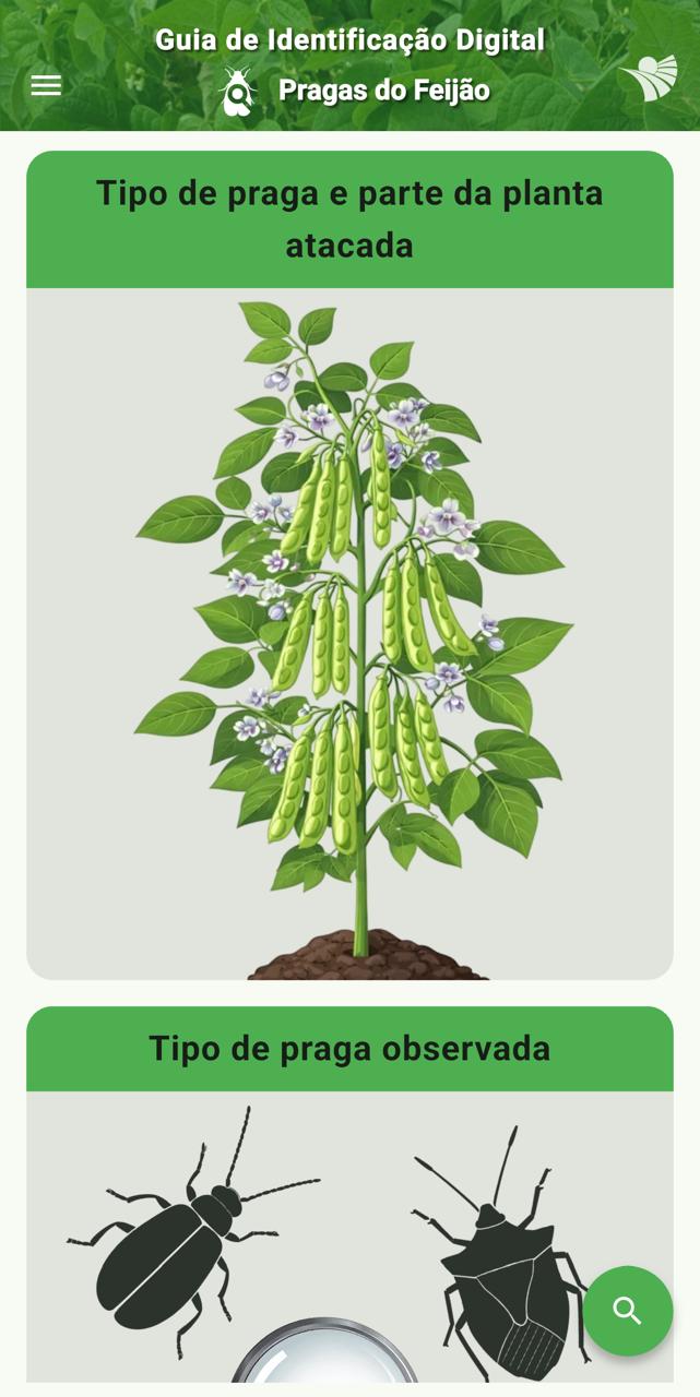 GID PRAGAS DO FEIJÃO - Disponível para download nas lojas Google Play e Apple Store, o aplicativo GID Pragas do Feijão foi concebido para facilitar a identificação de pragas nas diferentes fases de desenvolvimento da cultura, reunindo imagens, descrições técnicas e informações práticas que ajudam a reconhecer com precisão esses insetos nas lavouras. Intuitivo, o aplicativo permite a navegação por diferentes critérios, como a fase fenológica do feijoeiro ou características visuais das pragas, o que torna o processo de identificação ágil e assertivo. A proposta é reduzir dúvidas comuns no campo, evitando diagnósticos equivocados e contribuindo para um manejo mais eficiente.