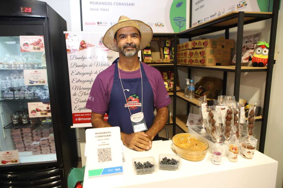 Novidades e aprendizado para novos expositores: Entre os estreantes da feira está o produtor Márcio Aurélio Villasboas, de Nova Tebas, que participa pela primeira vez do evento com a produção de morangos e mirtilos. A propriedade cultiva morangos há cerca de dez anos e introduziu o mirtilo há três.